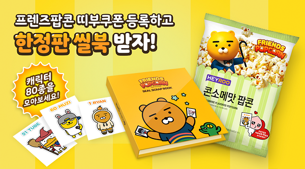 ‘프렌즈팝콘’ 한정판 씰북 증정 이벤트는 전국 CU(씨유) 편의점에서 판매되는 ‘HEYROO콘소메맛팝콘’에 포함된 띠부띠부씰(떼고 붙일 수 있는 스티커)을 통해 참여할 수 있다.