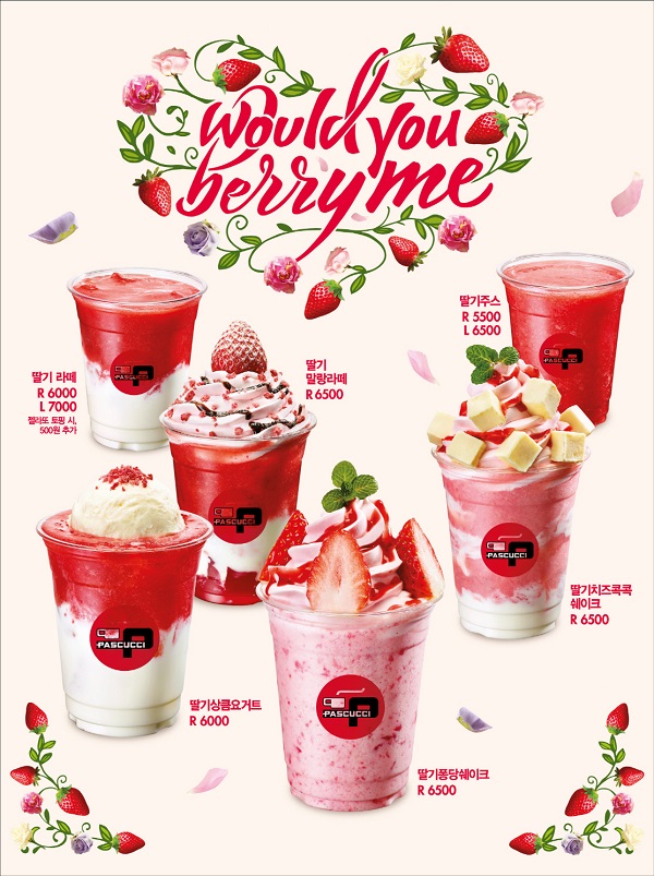 매년 많은 사랑을 받아온 파스쿠찌 딸기 음료의 올해 컨셉은 “Would you berry me?”로 “딸기 음료로 소중한 분에게 마음을 전달 하세요”라는 의미를 담고 있다. 특별히 딸기 시즌 동안 사용하는 컵 홀더에는 직접 메시지를 적을 수 있는 메모란을 마련해 선물로 전하기 좋도록 했다.