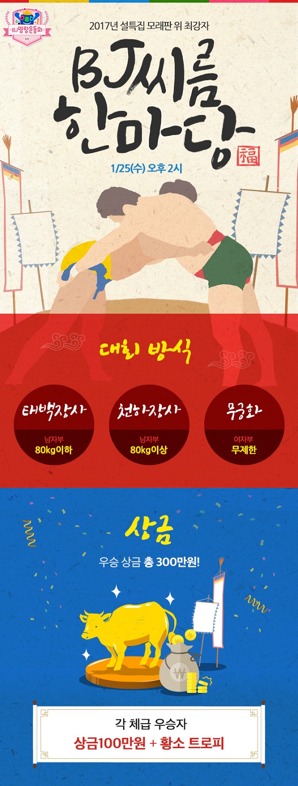 [뉴스비전e 정윤수 기자] 아프리카TV는 설 특집으로 25일 오후 2시부터 5시 30분까지 평택 이충레포츠공원 씨름전용경기장에서 ‘제2회 BJ 씨름 한마당’을 진행한다고 24일 밝혔다. 지난 추석에 이어 이번 설에도 BJ들이 씨름을 통해 승부를 가리는 이벤트 특집으로 마련됐다. 체급별 우승자에게는 상금 100만원과 황소 트로피를 수여한다.