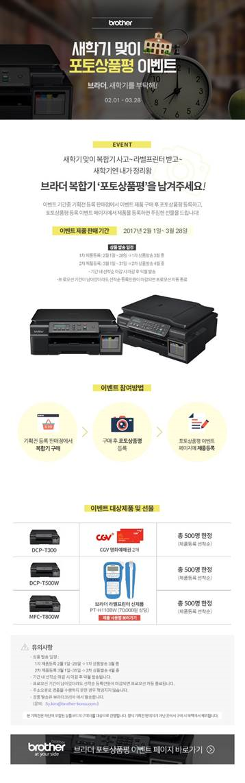DCP-T300 구매 고객 500명에게는 CGV 영화예매권 2매, DCP-T500W 및 MFC-T800W을 구매한 각 고객 500명에게는 7만원 상당의 브라더 라벨 프린터 신제품(PT-H110BW)을 증정할 계획이다.