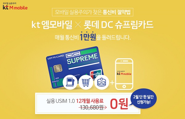 단, 프로모션 혜택은 다른 제휴사가 아닌 KT 엠모바일을 통해서 발급 받은 ‘롯데 DC 슈프림 카드’에 한해서만 적용된다.