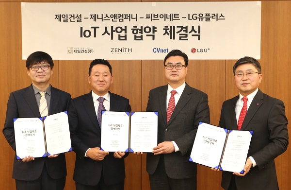 LG유플러스는 8일 서울 용산구 본사에서 제일건설을 비롯해 홈네트워크 시스템 개발사인 ‘씨브이네트’, 홈IoT 디바이스 공급사인 ‘제니스앤컴퍼니’의 임직원 30여명이 참석한 가운데 IoT 사업 협약식을 갖고 아파트 댁내 스마트홈 플랫폼 구축에 상호 협력키로 했다.