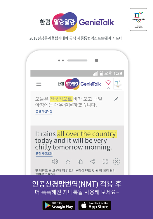 한컴과 한국전자통신연구원(ETRI)이 공동 개발한 ’한컴 말랑말랑 지니톡‘은 세계최고 수준의 한국어 기반 통번역 서비스를 제공하며, ‘2018 평창동계올림픽’ 공식 번역 소프트웨어로 4만 명의 선수들과 기자단, VIP들의 통번역 서비스를 담당하게 된다.