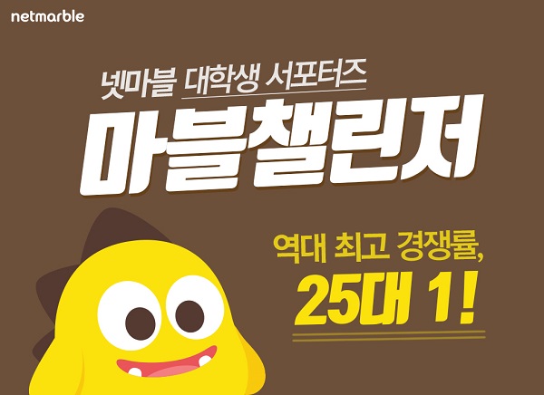 [뉴스비전e 장연우 기자] 넷마블게임즈는 대학생 서포터즈 ‘마블챌린저’ 9기 모집 경쟁률이 역대 최고인 25대 1을 기록했다고 15일 밝혔다.
