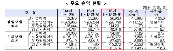 생명보험회사는 보험영업손실 확대와 투자영업이익 정체 등으로 당기순이익이 전년 대비 감소한 반면, 손해보험회사의 경우 자동차보험 영업손익은 개선됐다.
