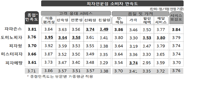 또한, 피자전문점 이용자 1,250명(업체별 각 250명)을 대상으로 조사한 결과, ‘이용편리성’(3.86점), ‘배달서비스’(3.72점), ‘맛·메뉴’(3.70점) 만족도는 높은 반면, ‘친절성’(3.38점), ‘할인혜택’(3.35점) 만족도는 상대적으로 낮은 것으로 나타났다.