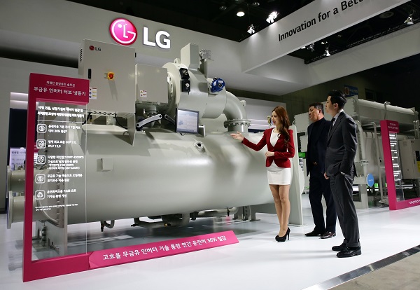 이번 전시회에서 LG전자는 윤활유를 쓰지 않는 무급유 인버터 터보 칠러 신제품을 공개했다. 이 제품은 컴프레서 내부 모터의 회전축을 지탱하기 위해 전자기력을 활용하는 마그네틱 베어링 방식을 적용했다. LG전자는 자체 기술로 마그네틱 베어링 컴프레서를 독자 개발해, 세계 최고 수준의 에너지 효율 및 세계 최대 수준의 용량(1,100RT)을 갖췄다.