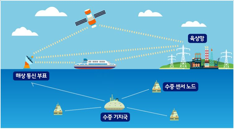 수중 통신망은 크게 수중 센서 · 수중 기지국 · 해상 통신 부표로 구성된다. 센서에서 수집된 정보는 기지국을 거쳐 해상 통신 부표로 전달되고, 이 데이터가 다시 위성·LTE 등 통신망을 거쳐 지상으로 전송되는 구조다. 물 속에서는 음파를, 공기 중에서는 전파를 이용해 데이터를 전송한다.