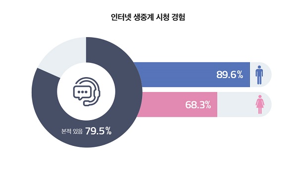 인터넷 생중계 서비스 플랫폼이 증가하고, 모바일을 통한 접근성이 강화되면서 전 연령층에서 인터넷 생중계 시청 경험이 증가하고 있는 것으로 조사됐다. 특히 남성(89.6%)의 시청 경험이 여성(68.3%) 대비 높게 나타났다.