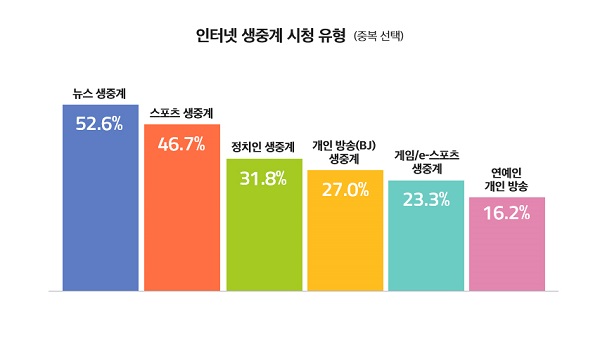 생중계로 시청한 콘텐츠 종류는 2016년 전반적인 이슈가 반영되면서 뉴스 생중계가 52.6%로 가장 높았으며, 다음으로 스포츠(46.7%), 정치인(31.8%), 개인 방송(BJ) 생중계(27%) 순이었다.