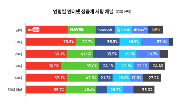 엔터테인먼트 콘텐츠를 선호하는 10대는 유튜브(73.3%)와 아프리카TV(37.%)에서 생중계를 시청하는 비율이 평균 이상으로 높았으나, 뉴스나 스포츠 생중계를 즐겨 시청하는 중장년층에서는 네이버와 다음의 이용 비율이 상대적으로 높게 나타났다.