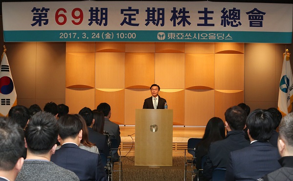 같은날(24일) 오전 동아쏘시오홀딩스는 동대문구 용신동 본사 7층 강당에서 주주 및 회사 경영진 등이 참석한 가운데 제69기 정기주주총회를 개최해 한종현 사장을 사내이사에 선임하는 안건을 통과시켰다.