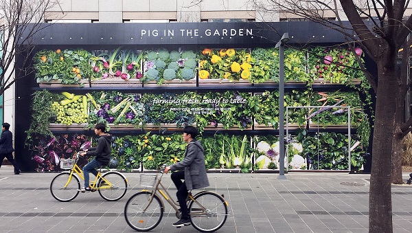 ‘피그인더가든’의 인테리어는 자연친화적이고, 쾌적한 분위기를 살렸다. 매장 정문에 들어서면 싱싱한 화초가 자라는 벽면을 볼 수 있으며, 테이블 곳곳에 과일 나무를 배치했다. 또한 오픈 바 형태로 꾸며, 만들어지는 과정을 한눈에 볼 수 있다.