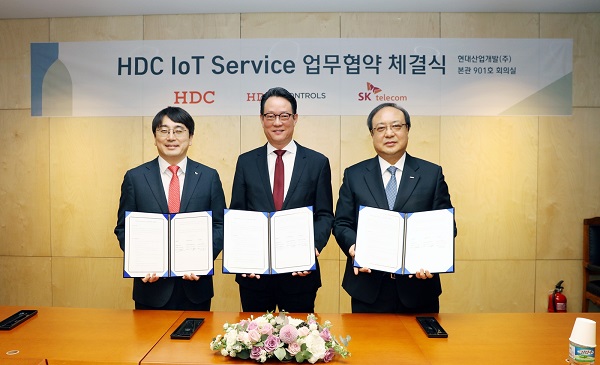 SK텔레콤과 HDC 현대산업개발, 홈네트워크 전문업체인 HDC 아이콘트롤스가 현대산업개발 용산 사옥에서 아이파크 아파트 내 AI와 IoT 서비스를 적용하는 내용의 제휴 계약을 체결했다고 27일 밝혔다.
