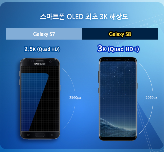 갤럭시S8(5.8인치)과 갤럭시S8플러스(6.2인치)는 스마트폰 OLED 최초로 3K QHD+(2960x1440) 해상도를 갖췄다.