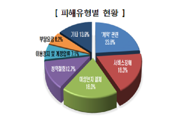 유형별로는 서비스 중단이나 변경 등 ‘계약’ 관련이 77건(23.8%)으로 가장 많았고, 서버 접속 불가 등 ‘서비스 장애’ 59건(18.3%), ‘미성년자 결제’ 58건(18.0%) 등이었다.