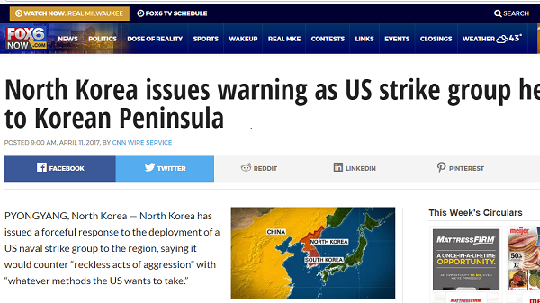 또 북한의 핵미사일 테스트 장소로부터 해변기준 200마일 떨어져 있는 한국과 미국 역시 칼빈슨(vison group)의 배치를 지지했다고도 이 매체는 밝혔다.