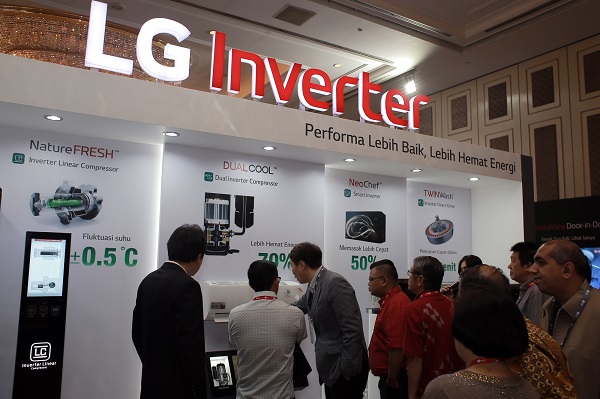 [뉴스비전e 이미정 기자] LG전자가 11일 인도네시아 자카르타 샹그리라 호텔에서 개최한 'LG 인버터 가전 공개 행사'에서 LG전자 인도네시아법인장 이재영 상무(왼쪽)과 조경남 H&A에어솔루션B2C해외영업FD 담당(오른쪽)이 LG전자의 인버터 가전을 소개하고 있다.
