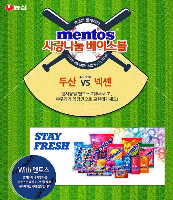이번 사랑나눔 베이스볼 행사는 멘토스롤 3개를 프로야구 입장권 1매로 교환해주는 방식으로 진행된다. 참가신청은 4월 14일부터 농심 공식 이벤트 홈페이지에서 가능하며, 선착순 마감이다.