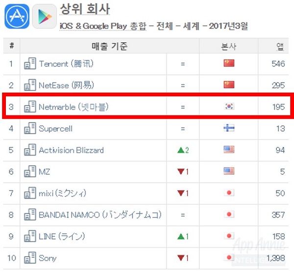 [뉴스비전e 장연우 기자] 넷마블게임즈는 모바일 앱 통계 분석 사이트 앱애니가 발표한 '앱스토어·구글플레이 총합 글로벌 게임 회사·앱 매출 인덱스(2017년 3월)'에서 자사가 글로벌 모바일 퍼블리셔 3위에 올랐다고 14일 밝혔다.