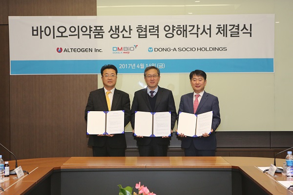 이날 체결식에는 디엠바이오 민병조 사장과 동아쏘시오홀딩스 한종현 사장, 알테오젠의 박순재 대표 및 3사 관계자들이 참석했다.