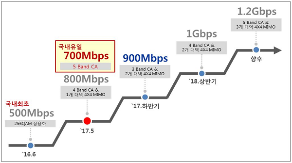 SK텔레콤은 내달 800Mbps급, 하반기에 900Mbps급 4.5G 서비스를 상용화하고, 내년 상반기 이후 ‘4/5밴드CA’에 4*4 다중안테나(MIMO) 등을 조합해 기가급 4.5G 서비스 제공을 목표로 하고 있다. 이를 위해, 5밴드CA, 4*4다중안테나, 256쾀(QAM) 등의 4.5G 핵심 기술을 전국 기지국에 적용하고 있다.
