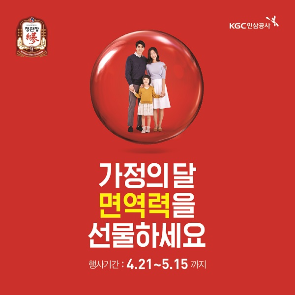 [뉴스비전e 이미정 기자] KGC인삼공사는 5월 가정의 달을 맞아 ‘면역력을 선물하세요!’ 행사를 5월 15일까지 진행한다고 20일 밝혔다.