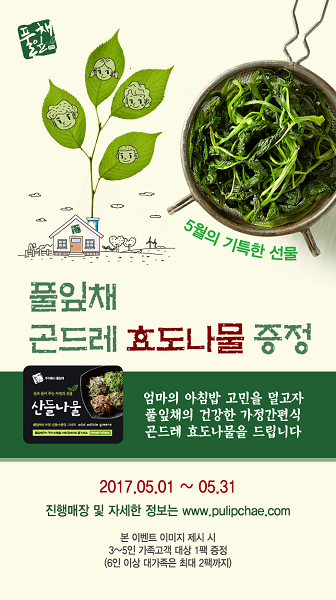 [뉴스비전e 김호성 기자] 프리미엄 한식뷔페 풀잎채(대표 정인기)가 5월 가정의 달을 맞아 ‘곤드레 효도나물 증정’ 이벤트를 진행한다.