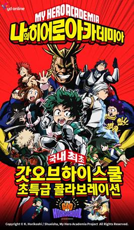 최강의 실력을 가리는 ‘갓 오브 하이스쿨’의 게임성과 최강 영웅 스토리를 담은 ‘히로아카’가 만나 높은 시너지 효과를 낼 것으로 기대하고 있으며, ‘히로아카’가 국내에서도 두터운 팬층을 보유하고 있는 만큼 강력한 콜라보레이션이 될 것으로 보인다.