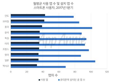 한편 앱 조사기관인 앱애니에 의하면 스마트폰 사용자들은 평균적으로 매월 30개 이상의 앱을 사용하고 있다. 이는 설치된 앱의 35~50%에 이르는 수준이다. 앱을 통해 생활을 관리하려는 소비자 성향이 전반적인 추세로 나타나고, 많은 산업 분야에서도 앱은 점점 더 필수 요소가 되고 있다는 분석이다.