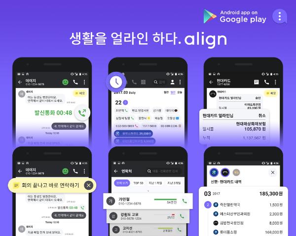 얼라인은 통화와 문자 서비스를 기반으로 한 통합 커뮤니케이션 관리 앱으로, 주소록과 일정 관리를 비롯한 사용자 중심의 다양한 기능을 선보인다.