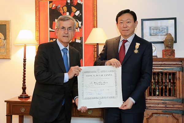 [뉴스비전e 김호성 기자] 롯데그룹은 신동빈 회장이 18일, 한국과 스페인 양국 간 관계 강화에 기여한 공로로 펠리페 6세 스페인 국왕이 수여하는 훈장인 이사벨 여왕 십자문화대훈장 (The Cross of Official of the Order Isabel La Catolica)을 받았다고 19일 밝혔다.