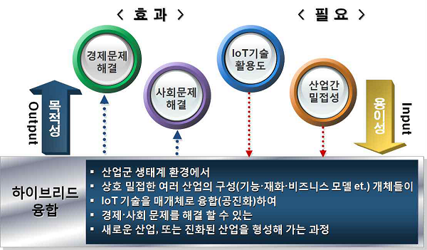 경제‧사회 문제 해결을 위해서는 편협된 ICT융합이 아닌 산업간‧산업내 고유 기능 등이 결합되어 혁신적인 산업이나 사회적 편익을 창출하는 하이브리드(Hybrid) 융합이 필요하다는 것이다.