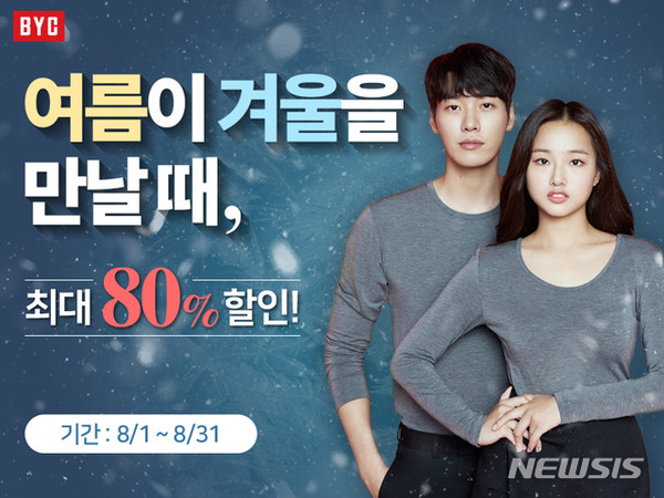 9일 업계에 따르면 토종브랜드 BYC는 오는 31일까지 겨울 상품들을 할인된 가격으로 판매하는 역시즌 페스티벌 기획전을 진행 중이다. 보디히트, 에어메리, 스콜피오 등 기능성 발열웨어를 최대 80% 할인된 가격으로 구입할 수 있는 이벤트다.