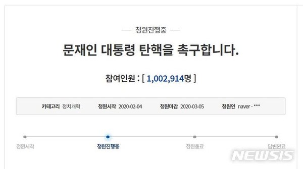 특히 이날 오후 3시15분 기준 '문재인 대통령의 탄핵을 촉구한다'는 청원에는 106만3435명이 동의했다. 해당 청원은 지난 4일 게시된 것으로 "코로나19 사태에 있어 문재인 대통령의 대처를 보면 볼수록, 대한민국의 대통령이 아닌 중국의 대통령을 보는 듯하다"며 "문재인 대통령을 우리나라 대통령이라고 생각하기 어렵다" 며 탄핵을 촉구하고 있다.