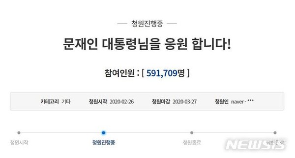 코로나19 정부의 대응을 두고 문재인 대통령을 둘러싼 일부 시민들의 탄핵과 응원 청원에 불이 붙었다.