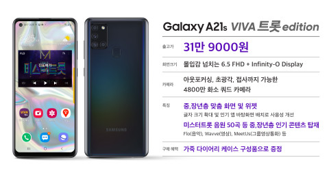 ‘A21s VIVA 트롯’은 출고가에 31만9000원에 중·장년층이 보기 편한 6.5인치 HD+ 급 디스플레이와 아웃포커싱, 접사 등이 가능한 4800만 화소 쿼드 카메라를 장착한 가성비 좋은 스마트폰이다.