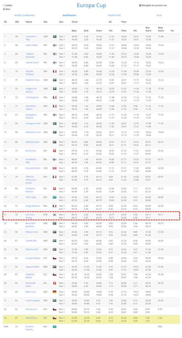 지난 2021년1월30일~31일 스웨덴 Are(아레)에서 개최된 Freestyle mogul Europa Cup에서 대한민국의 '이윤승(2006년생)'선수가 최연소/첫출전에서 21위의 놀라운 성적을 거두는 쾌거를이루어 냈다.