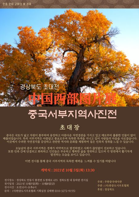 주한 중국대사관이 주최하고 한중도시우호협회가 주관하며 경상북도가 후원하는 이번 전시회는 중국 서부지역 자연 풍광과 발전 모습을 담은 사진 작품 60점이 전시된다.
