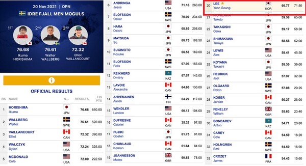 지난 11월20일~21일에 치뤄진 '2021 스웨덴 Idre FIS 오픈 모굴대회'에서 대한민국의 '이윤승'(만15세) 선수가 전세계 20개국 90명의 정상급 선수가 출전한 가운데 20위라는 좋은성적으로 대회를 마쳤다.