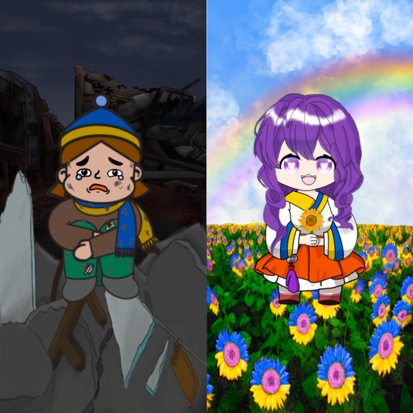 ‘우크라이나 헌정 NFT’는 전쟁의 겪고 있는 울고 있는 아이와 전쟁이 종료 후 다시 희망으로 가득 찬 우크라이나를 표현.