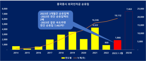 전세계가 모두 미워하고 분노하는 전세계 공공의 적 중국에서 외국인자금의 행태가 묘하다. 서방은 입으로는 반중, 탈중이라고 하지만 돈은 중국으로 계속 퍼 넣고 있다. 2023년 1분기 중국증시에 유입된 자금은 1866억위안으로 2022년 연간 총유입액 900억위안의 2배를 넘었다. 이런 추세가 그대로 이어진다면 연간으로는 7463억위안이다.