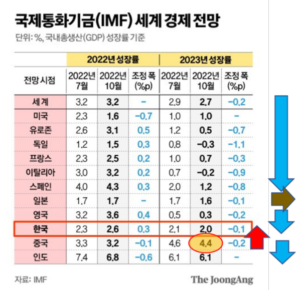 물은 높은데서 낮은 데로 흐르지만 돈은 반대다. 성장률이 낮은데서 높은데로 간다. 2023년 전세계 주요국 성장률을 보면 2022년보다 2023년 성장률이 더 높은 나라는 중국이 유일하다. 돈은 정확히 성장률 공격을 하고 있다.