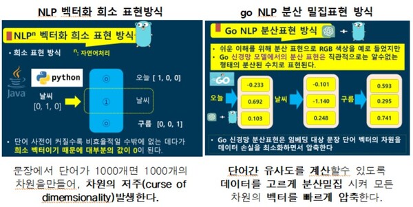 기존 '차원의 저주'로 hyper AI 챗봇의 고차원 처리시 메모리 낭비와 복잡연산에 취약한 원-핫(One-hot) 인코딩 방식의 문장과 단어 임베딩(희소표현방식의 벡터화)를 구글 golang NLP 임베딩에서는 분산 밀집표현으로 바꾸어 이를 혁신적으로 개선했다.