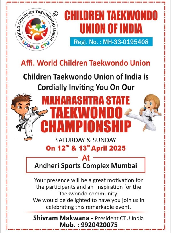 최초로 세계어린이태권도연맹 (CTU) 챔피언십이 2025년 4월 12일 토요일 뭄바이에서 열렸으며, 마하라슈트라 및 그 외 주변 지역에서 4세에서 16세 사이의 600명 이상의 어린이들이 참가했다.