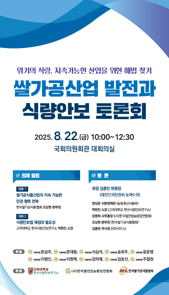 고려대학교 한국식량안보연구소, (사)한국쌀전업농중앙연합회, 한국쌀가공식품협회가 주관하는 이날 행사에서는 쌀가공식품산업의 지속 가능한 민관 협력전략(조상현 한국쌀가공식품협회 본부장)과 식량안보법 제정의 필요성(박현진 고려대 한국식량안보연구소장)이 제기되며 김춘진 대한민국헌정회 농해수위원장이 좌장을 맡고 변상문 농림축산식품부식량정책관, 임명희 (사)한국쌀전업농중앙연합회 사무총장, 김종욱 (주)시아스부사장등이 패널로 참여하여 청중들과 열띤 토론을 이어갈 예정이다.