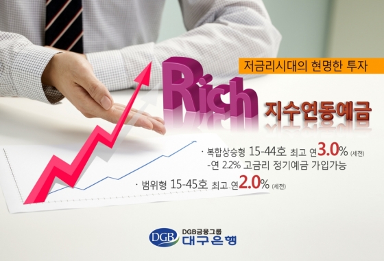 DGB대구은행 관계자는 "초저금리시대에 원금이 보장되면서 주식시장의 변동성에 의해 좋은 금리를 기대할 수 있는 Rich지수연동예금을 대안상품으로 추천한다"고 밝혔다.
