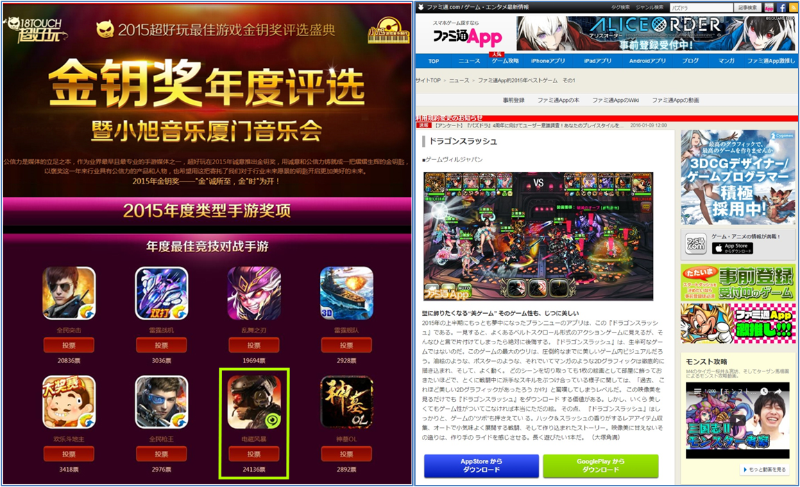 일본에서는 유명 게임 매체인 ‘패미통’에서 선정한 ‘2015 베스트 게임 5종’에는 ‘드래곤 블레이즈(일본 서비스 명 : 드래곤 슬래쉬)’가 선정됐다.