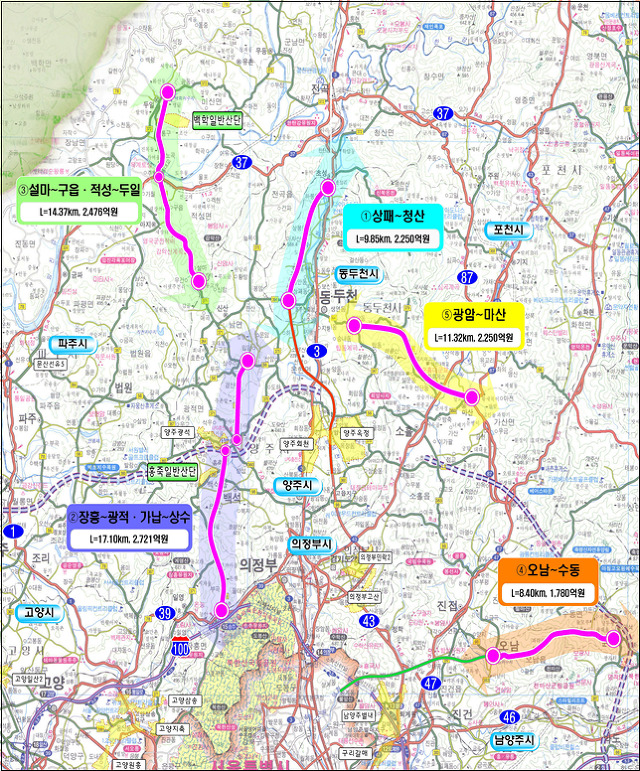 현재 추진 중인 북부 5대도로 사업현장은 ▲국도대체우회도로 3호선(동두천 상패~연천 청산) 9.9km, ▲국지도 39호선(양주 장흥~광적·가납~상수) 17.1km, ▲지방도 371호선(파주 설마~구읍·연천 적성~두일) 14.3km, ▲국지도 98호선(남양주 오남~수동) 8.4km, ▲지방도 364호선(동두천 광암~포천 마산) 11.3km 등이다.