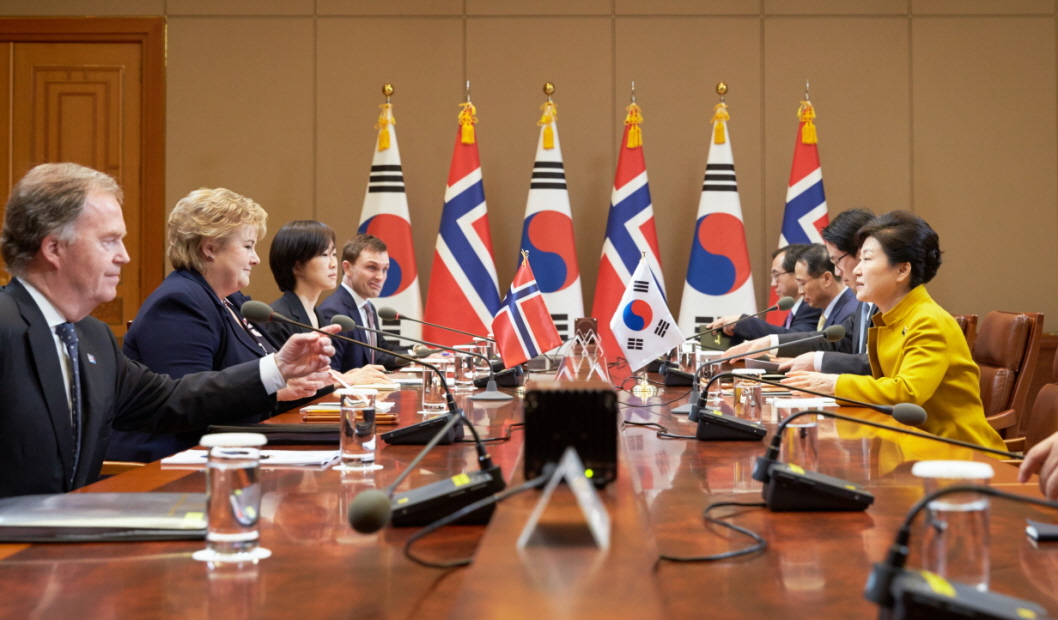 박 대통령은 15일 오전 청와대에서 솔베르그 총리와의 정상회담을 갖고 △한-노르웨이 간 실질협력 증진 및 미래지향적 협력방안 △한반도 등 지역정세 △지속가능개발 및 기후변화 대응 방안 등에 대해 협의했다.